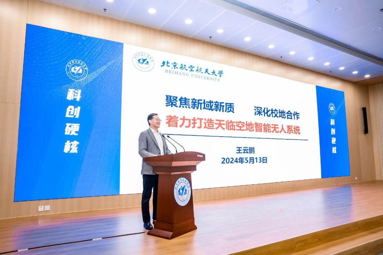 揭牌仪式后,王云鹏以《聚焦新域新质 深化校地合作 着力打造天临空地智能无人系统》为题作主旨报告。